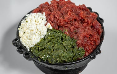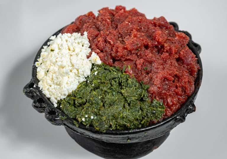 Ethiopian-styled steak tartar, freshly minced extra-lean beef seasoned with mitmita and Ethiopian spiced butter. Served with a side of feta cheese and collard greens.