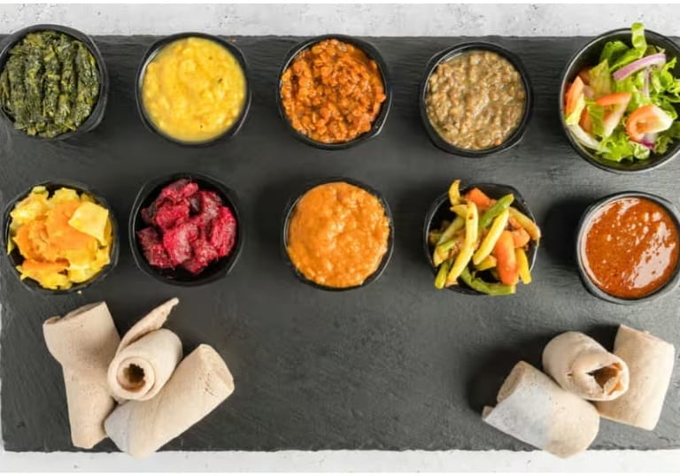 No Ethiopian meal is complete without Injera, the soft, spongy, and slightly tangy Ethiopian flatbread. Made from teff flour, this naturally gluten-free bread is not just an accompaniment—it’s an essential part of the meal, used to scoop up flavorful stews, lentils, and meats.